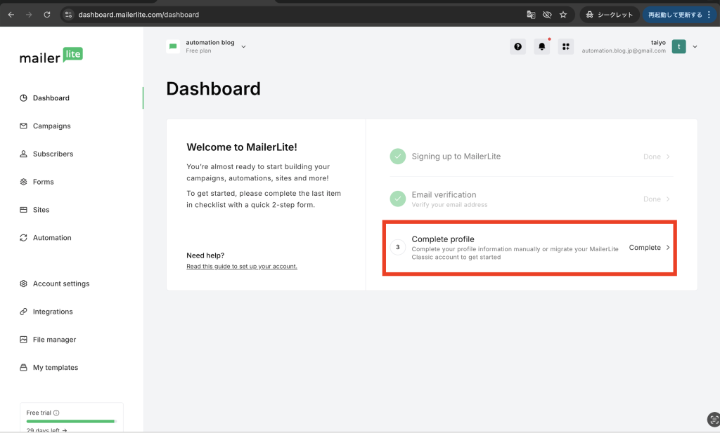 MailerLiteにログインすると、ダッシュボード右側に「Complete profile」と表示されることがあります。