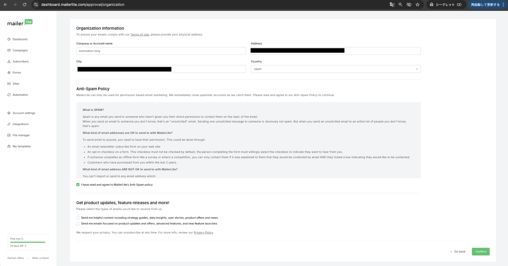 チェックリストを確認し、最下部のI have read and agree to MailerLite’s Anti-Spam policyチェックボックスに ✅ を入れます。