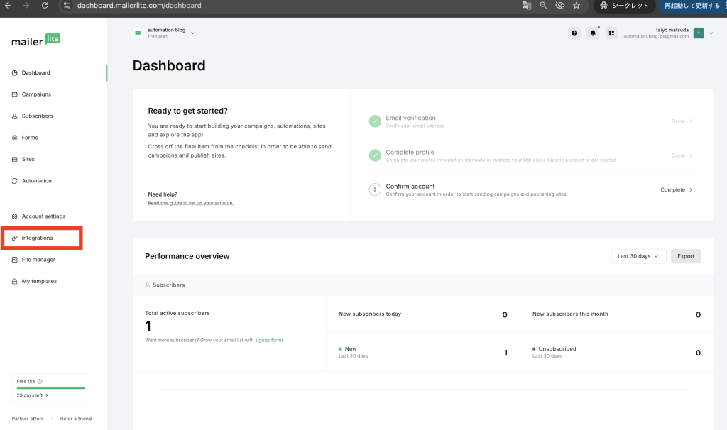 🔰 まだMailerLiteのアカウントをお持ちでない方は、先にこちらのガイドをご覧ください