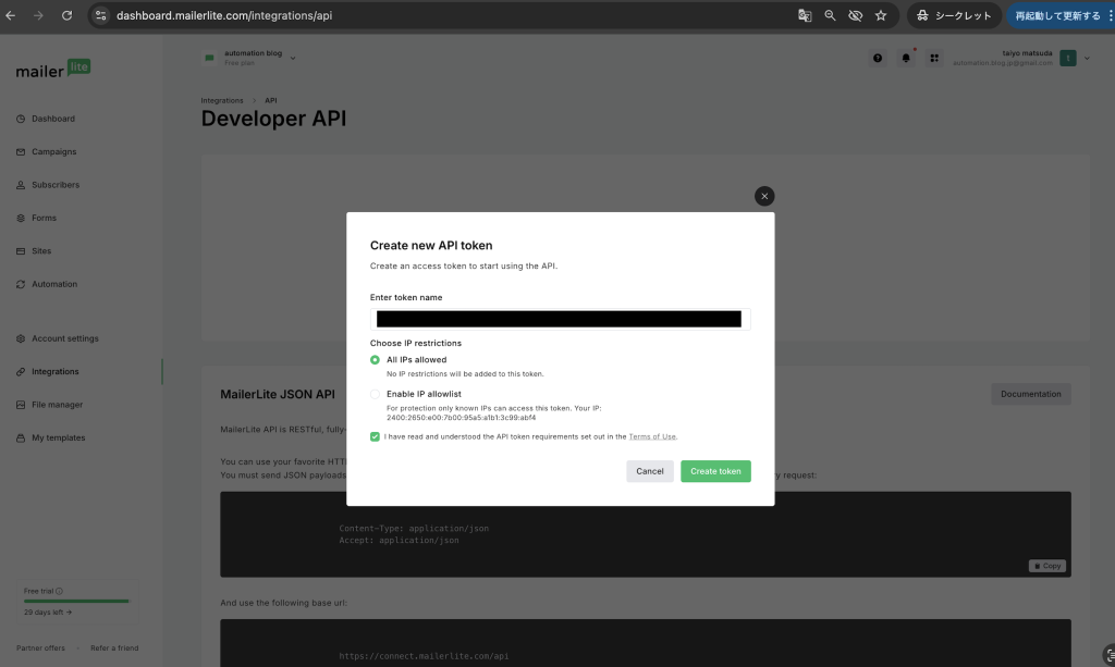 ここでは、MailerLiteと外部ツール(n8n、Zapierなど)を連携するために必要な「APIキー(トークン)」を発行します。