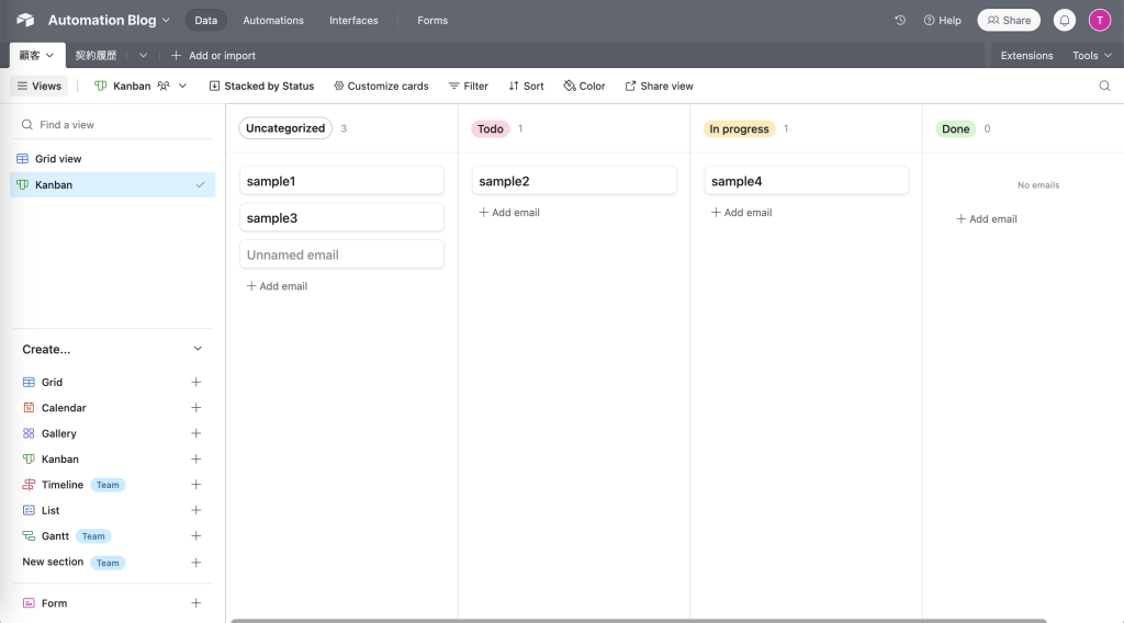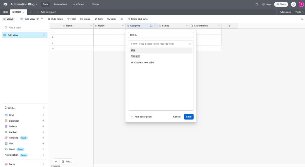 たとえば、「顧客」テーブルと「契約履歴」テーブルをリンクすることで、「Aさんの過去契約一覧」を自動で表示できます。従来のスプレッドシートでは複雑な関数が必要だった処理も、Airtableなら数クリックで実現。